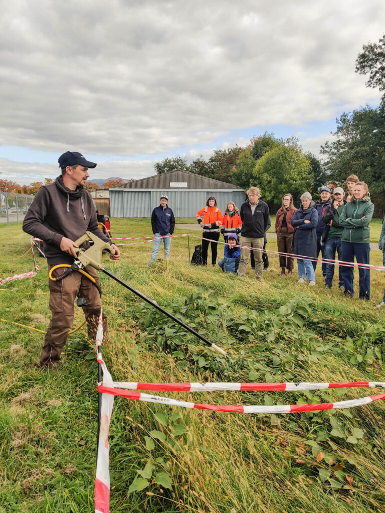 Am Nachmittag ging es hinaus zum Freiburger Flugplatz. Dort erhielten wir eine Vorführung der Elektrolanze zur Bekämpfung von Neophyten – in diesem Fall des japanischen Staudenknöterichs (Reynoutria japonica). Ergänzend wurden uns die Funktionsweise und die verschiedenen Einsatzmöglichkeiten des Geräts erklärt.