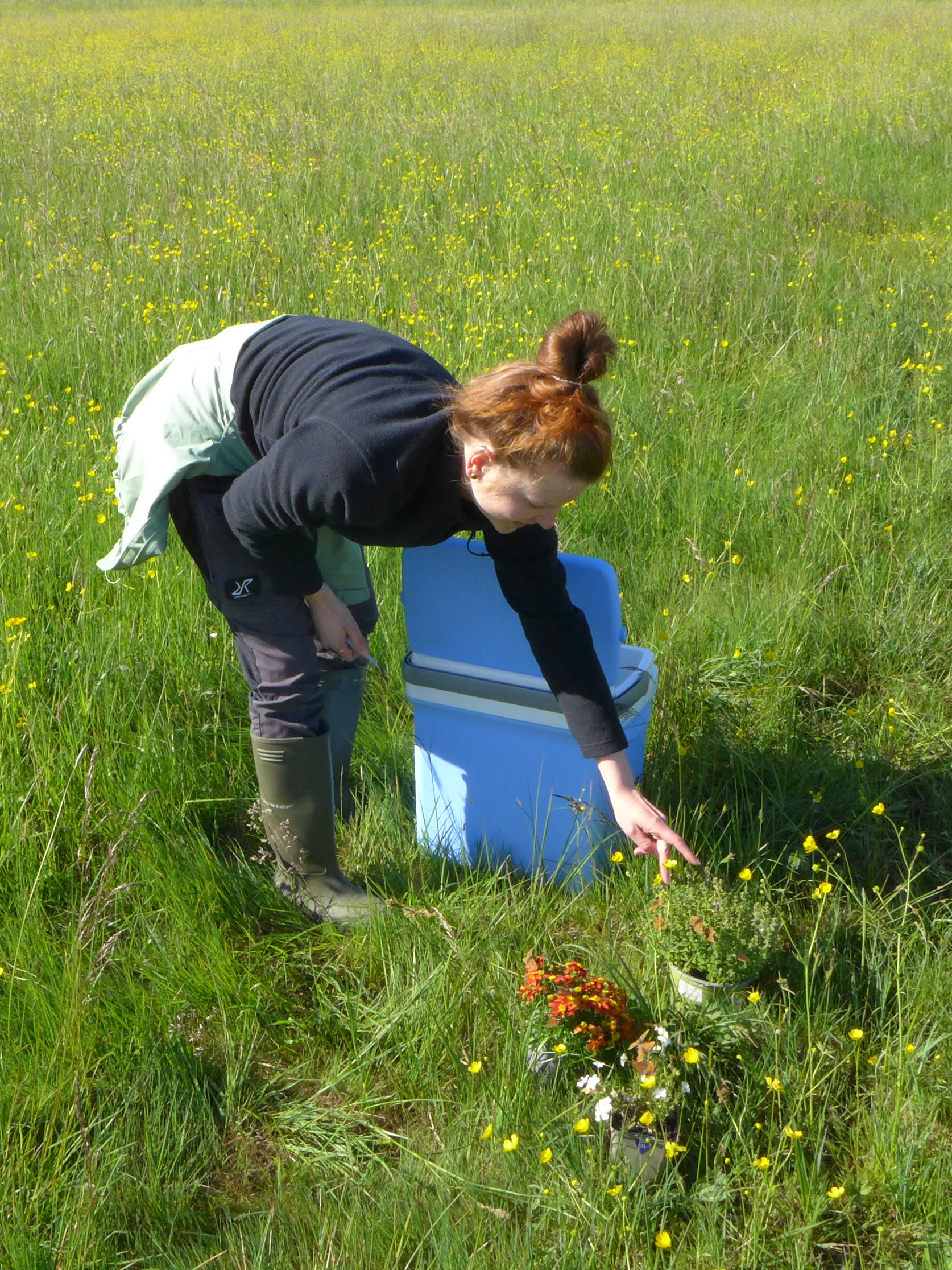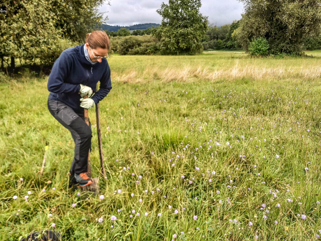 Anfang September wurden schließlich drei Töpfe mit Succisa-Pflanzen und mehreren Gespinsten in das Naturschutzgebiet Korbmatten gebracht. Die Standorte wurden markiert und mit dem Landschaftserhaltungsverband abgestimmt, damit die Bereiche bei der Mahd ausgespart bleiben.