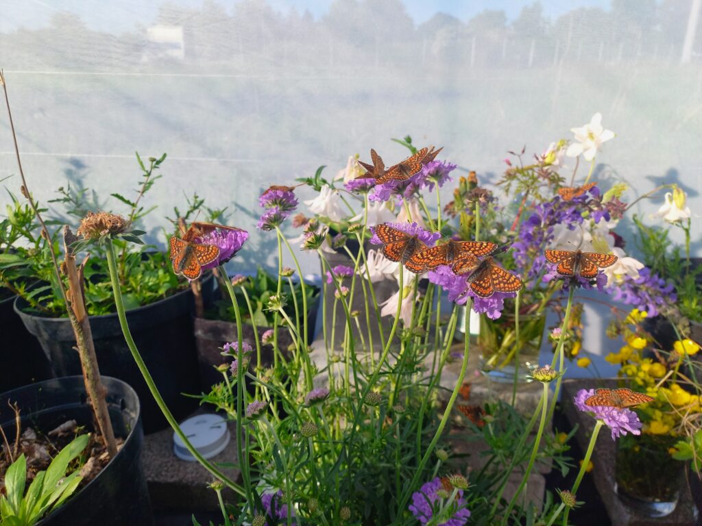 Nach der Winterruhe zeigten sich an einem sehr warmen Tag im Januar 2025 die ersten Lebenszeichen in den Zuchtzelten in Bruchsal: Zahlreiche Raupen erwachten mit den ersten warmen Sonnenstrahlen und sonnten sich auf den verdorrten Pflanzenresten. Anfang März begannen sie an den frischen Blättern ihrer Hauptnahrungspflanze, dem im Botanischen Garten des KIT Karlsruhe vorgezogenen Gewöhnlichen Teufelsabbiss (Succisa pratensis), zu fressen. Ende März konnten rund 500 überwinterte Individuen gezählt werden. Bald schon schien die Futterquelle erschöpft zu sein, sodass zusätzlich Wilde Karde (Dipsacus fullonum) gefüttert und ebenfalls begeistert angenommen wurde.