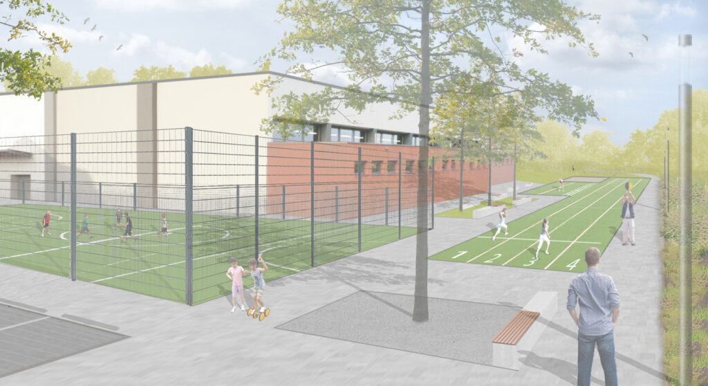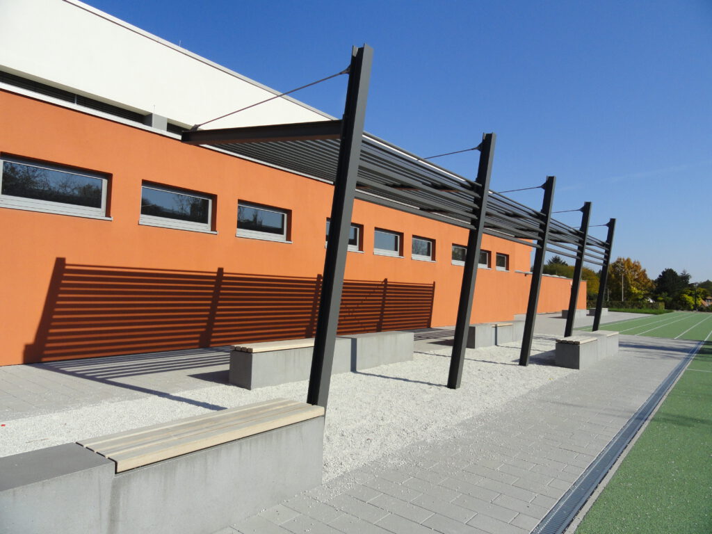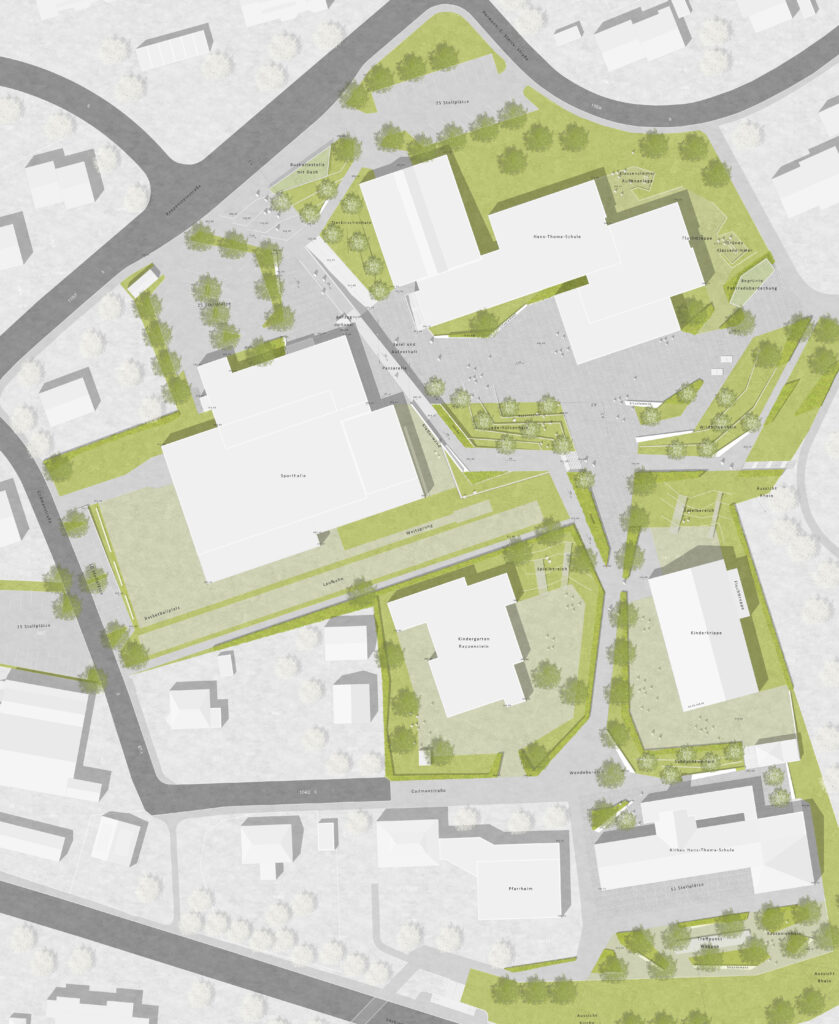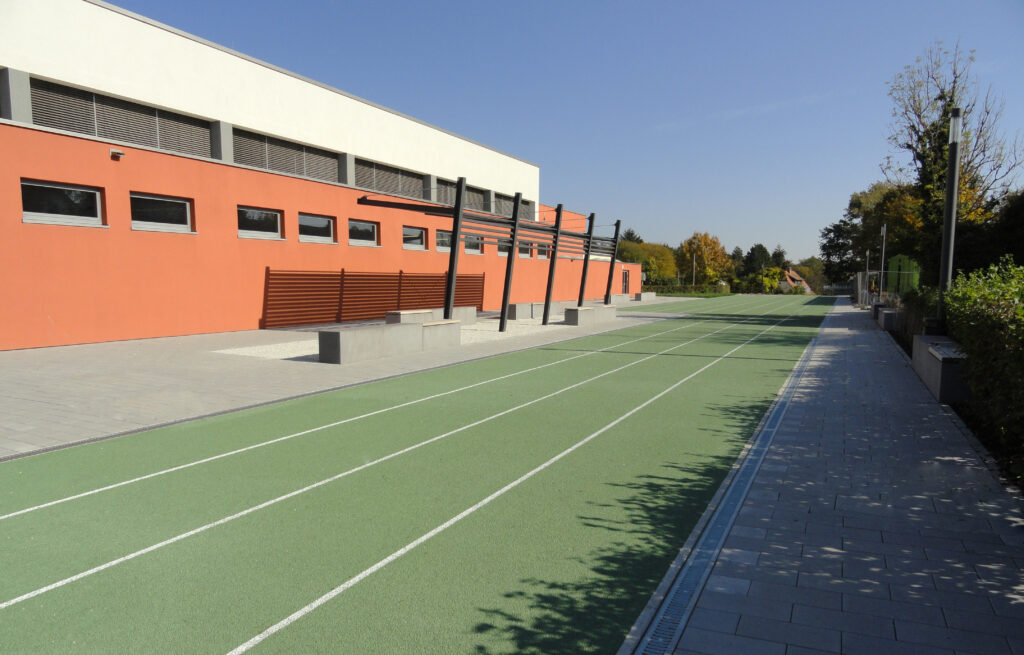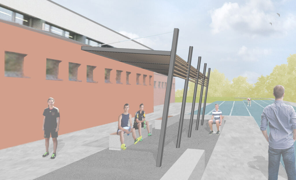 Zwischen der Laufbahn im Süden und der Halle im Norden, finden zwei Sitzgruppen ihren Platz. Betonbänke mit Holzauflagen bieten Platz zum Verschnaufen. Verschiedene Beschattungsvarianten in Form von Bäumen oder Sonnensegeln sorgen für Atmosphäre. Umgeben werden die Sitzplätze von einem leicht changierenden, grauen, im Reihenverband verlegten Betonpflaster mit zwei Oberflächen. Ein Weg im Süden, entlang der Laufbahn, wird von Sitzgelegenheiten und Gehölzen eingerahmt. Er geht östlich in eine provisorische Rampe über, die den Zugang zum bestehenden Schulhof ermöglicht. Dieser Aufgang wird mittels Natursteinblöcken, die den Höhenunterschied auffangen, optisch abgetrennt. Stufen ermöglichen zusätzlich den direkten Zugang.
