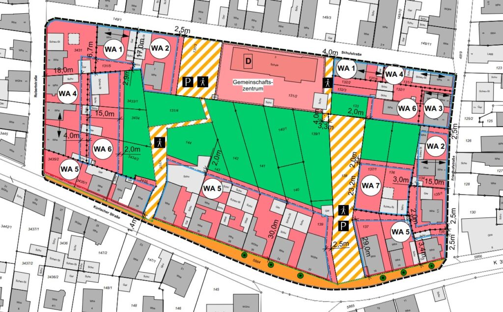 Der Bebauungsplan ist damit ein klassisches Beispiel einer Innenentwicklung, die vorhandene Strukturen nutzt und zugleich neuen Wohnraum schafft. Während der straßenseitige Bestand gesichert und dadurch in seiner prägenden Form erhalten bleibt, wird der rückwärtige Bereich für eine ergänzende Bebauung geöffnet.