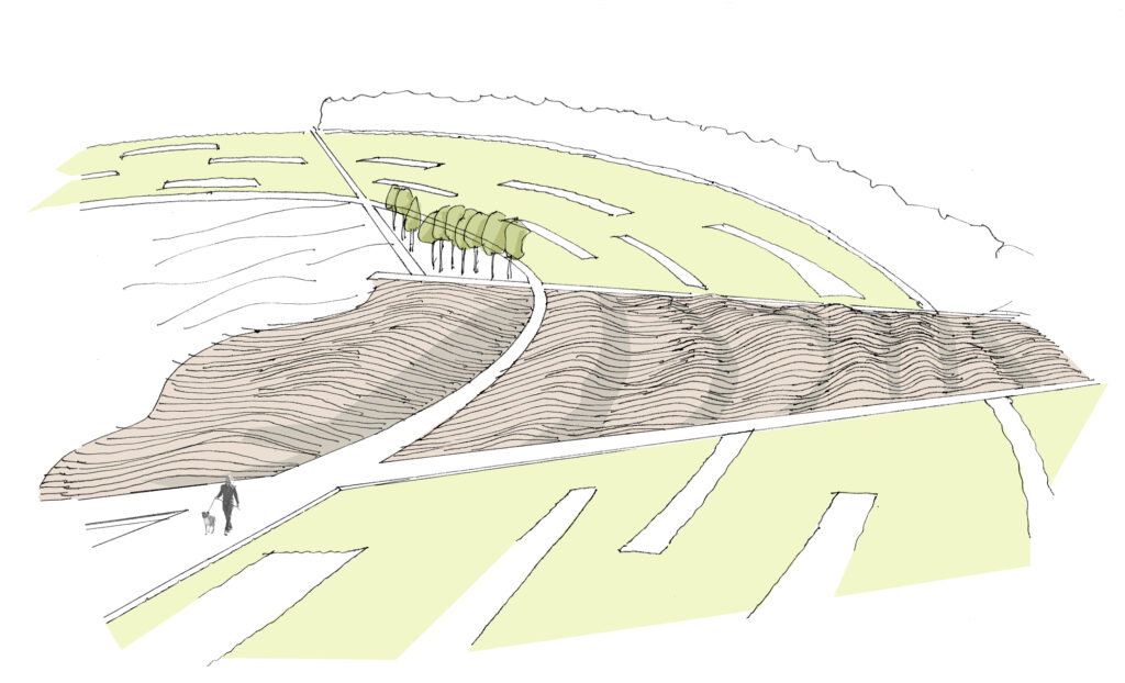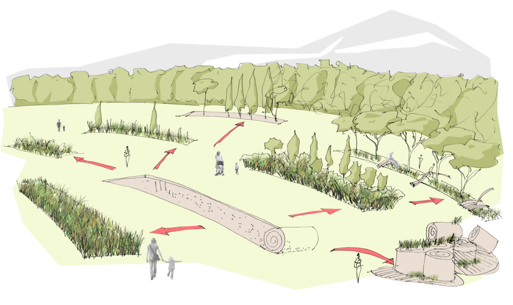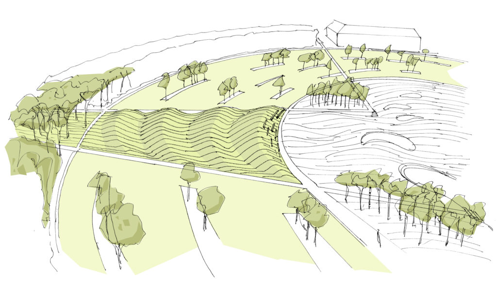 Eine Pferderennbahn mit innenliegendem Golfplatz wird zum Park! Alte und neue Landschaftselemente, die sich collagenartig zusammensetzen und so ein neues Stück nutzbare und lesbare Landschaft formulieren, bilden das Leitbild unseres Entwurfes. Diese Elemente werden durch die dominierende Weite des Ortes und ein klar ablesbares Erschließungskonzept verknüpft und gestalterisch eingebunden. Die heute bestehende Gliederung in Form des waldartigem Rahmens, der Rennbahn und der zentraler Wiesenfläche wird beibehalten und weiterentwickelt.