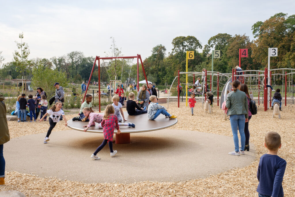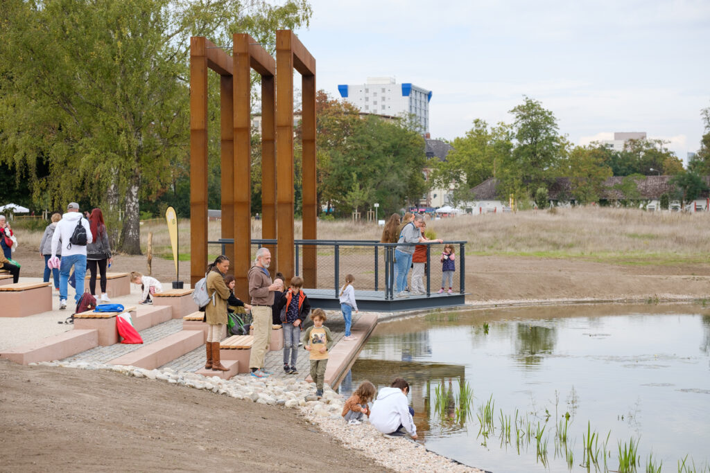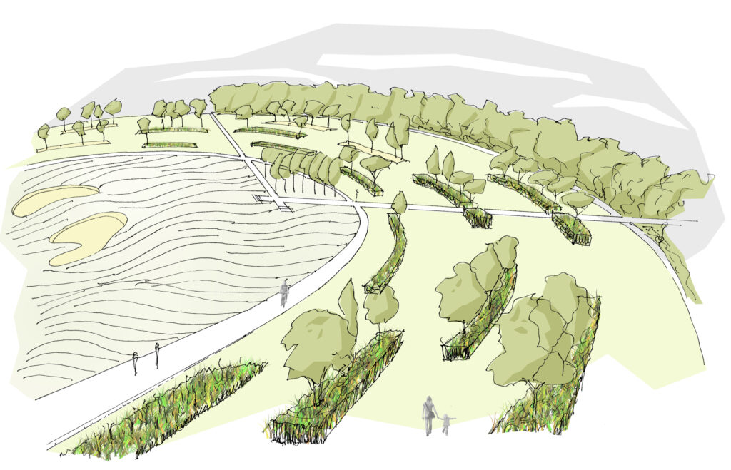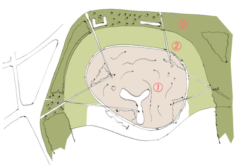 Im Zentrum, dem ursprünglichen Golfplatz, bleiben die sich zwischenzeitlich entwickelten, ökologisch wertvollen Sandmagerrasen erhalten. Die durch die Golfplatznutzung entstandenen Sandbunker werden in das Konzept integriert. Auch der Baumbestand sowie der Teich werden erhalten. Ein Rundweg übernimmt die Erschließung, nimmt die Form der Rennbahn auf und stellt die optische Trennung vom intensiv genutzten zweiten Bereich dar. Im Zentrum bleibt der bestehende Teich erhalten und wird durch einen Steg mit »Pavillon«, der den Ausblick über die Wasserfläche und die Weite der ökologischen Flächen freigibt, ergänzt. Im nordöstlichen Teil werden Sandhügel aufgeschüttet, die sich im Laufe der Zeit durch Erosion und Nutzung verändern. Auf diese Weise entwickeln sich neue dynamische Lebensbereiche, welche zur Biodiversität im Park beitragen. Die ehemalige Rennbahn wird durch schrittweise Veränderungen zu einem intensiv nutzbaren Parkbereich umgebaut. Ein sich über mehrere Jahre hinweg entwickelndes Vegetationskonzept bildet die Basis zur Definition von Räumen, die für Freizeitnutzung zur Verfügung stehen. Hierzu zählen unter anderem eine Calisthenics-Anlage und ein großzügiger Spielplatz mit angrenzendem Bolzplatz. Lineare Baumpflanzungen stellen Assoziationen zur Bewegungen der Pferde dar. Umrahmt wird das Gebiet durch die bereits bestehende Baumkulisse, die durch gezieltes Pflegemanagement ökologisch aufgewertet wird und die Eingänge zum Park definiert.