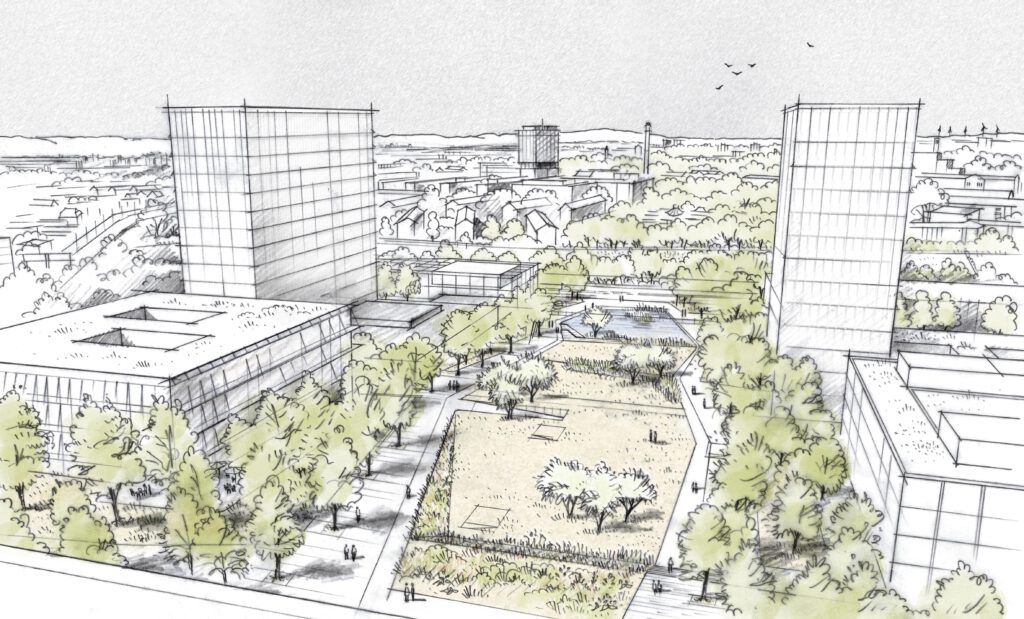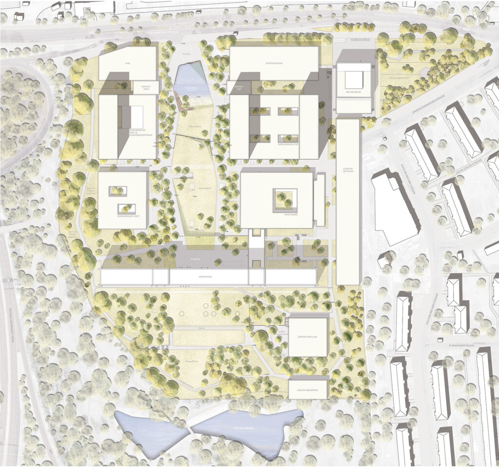 Räumlich klar und atmosphärisch einladend – Die klare räumliche Struktur und das verbindende grüne Band bilden das Rückgrat des Entwurfs und die Grundlage für eine repräsentative und hochwertige, sowie ökologische und nachhaltige Gestaltung. Ziel ist die Schaffung langfristig funktionierender Strukturen, die sich flexibel an sich stetig wandelnde Anforderungen anpassen können. So wird Nachhaltigkeit nicht nur zum Thema bei der Auswahl von Materialien sondern bereits bei der langfristigen Sicherung funktionierender Grundstrukturen.