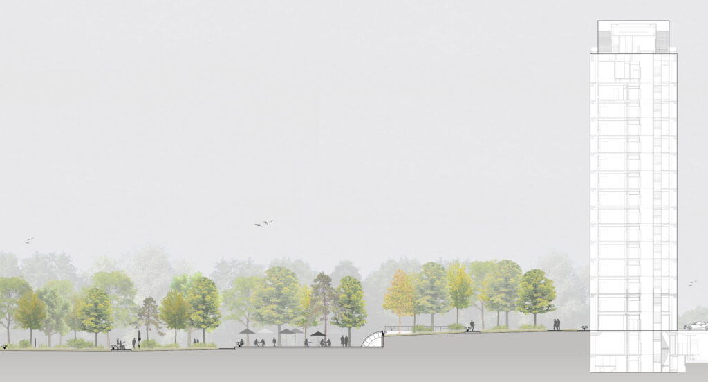 Grüner Ruheraum – ökologisch, nachhaltig und entspannend – Das Grüne Band erstreckt sich südlich des Hauptgebäudes weiter in Richtung Süden und greift die Verbindung zum Miquelweiher auf. Die begleitende Baumstruktur im Westen, löst sich auch hier zum Übergang in die Miquelanlage nach Westen hin auf. Zusätzlich beherbergt sie die fußläufige Verbindung in Form eines Weges, entlang dessen die Sportangebote platziert sind. Während ein Abzweig des Grünen Bandes nach Südwesten zum Miquelweiher überleitet, schafft ein weiterer Abzweig die Verbindung zum südöstlichen Pavillon und der angrenzenden Wache. Beide Abzweige werden durch einem Weg verbunden, der als Skulpturenpfad dient. Unter den zahlreichen Bäumen finden die vorhandenen und neuen Skulpturen ihren Platz. Der neue Pavillon wird an das Wegenetz angebunden und durch eine Rampenanlage mit vorgelagertem Sitzbereich zum Teil des Parks. Unter Bäumen und inmitten einer üppigen Bepflanzung lässt sich hier entspannt ein Kaffee trinken. Zudem bildet der Pavillon den räumlichen Bezug zum Kasino und greift die bestehende Topografie auf.