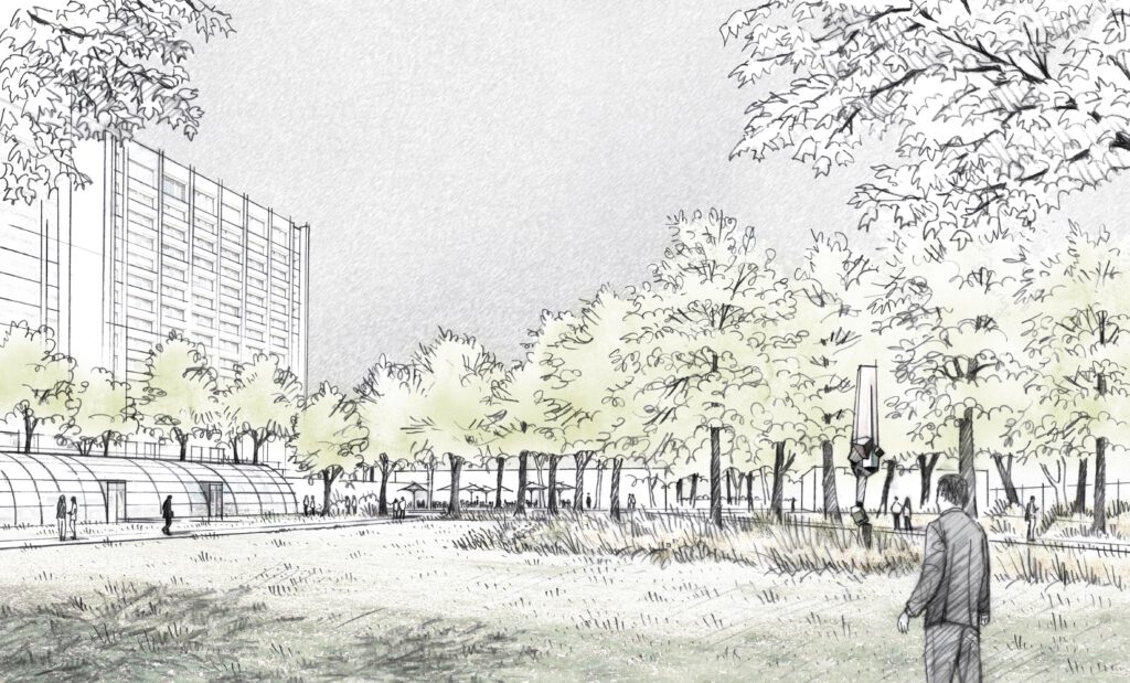 Die Ränder des grünen Bandes sind bewusst als Kontrast zur offenen Mitte angelegt. Auf der Westseite wird die Zufahrt zum Hauptgebäude organisiert. Diese versteht sich als Promenade, die barrierefrei Richtung Hauptgebäude ansteigt, wo Fahrzeuge und Fußgänger gleichberechtigt sind. Die Zugänge zu den neuen Gebäuden erhalten Vorzonen, die sich durch elegant in die Topografie verlaufende Treppenstufen abheben und die von einer üppigen Stauden- und Gräserpflanzung gerahmt werden. Überstanden sind diese Bereiche von einer hainartigen Struktur aus Einzelbäumen, die sich zur Mitte des grünen Bandes hin verdichten und nach Westen in eine lockere Struktur auslaufen. So gelingt der fließende Übergang zur angrenzenden Miquelanlage. Selbstverständlich fügen sich die Außenfläche der Kita und die nach Süden verlaufende, fußläufige Wegeverbindung in diese Struktur ein und verbinden die punktuellen Fitnessangebote.