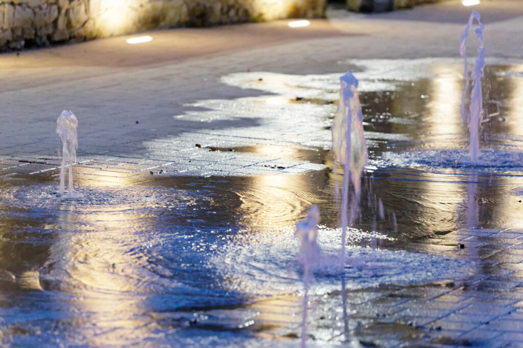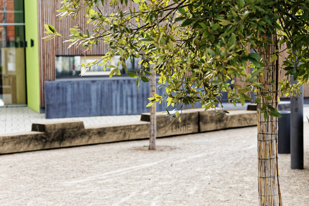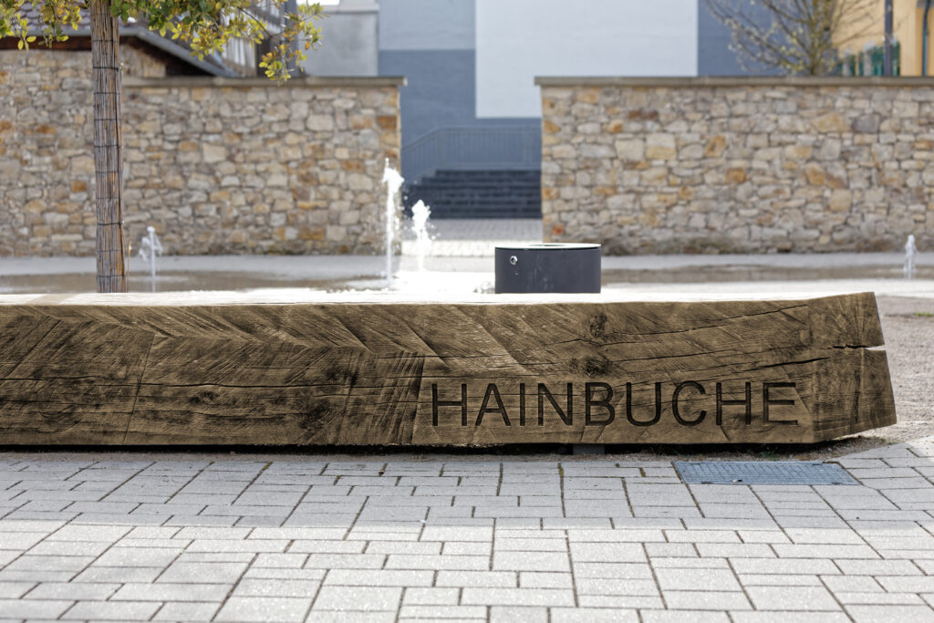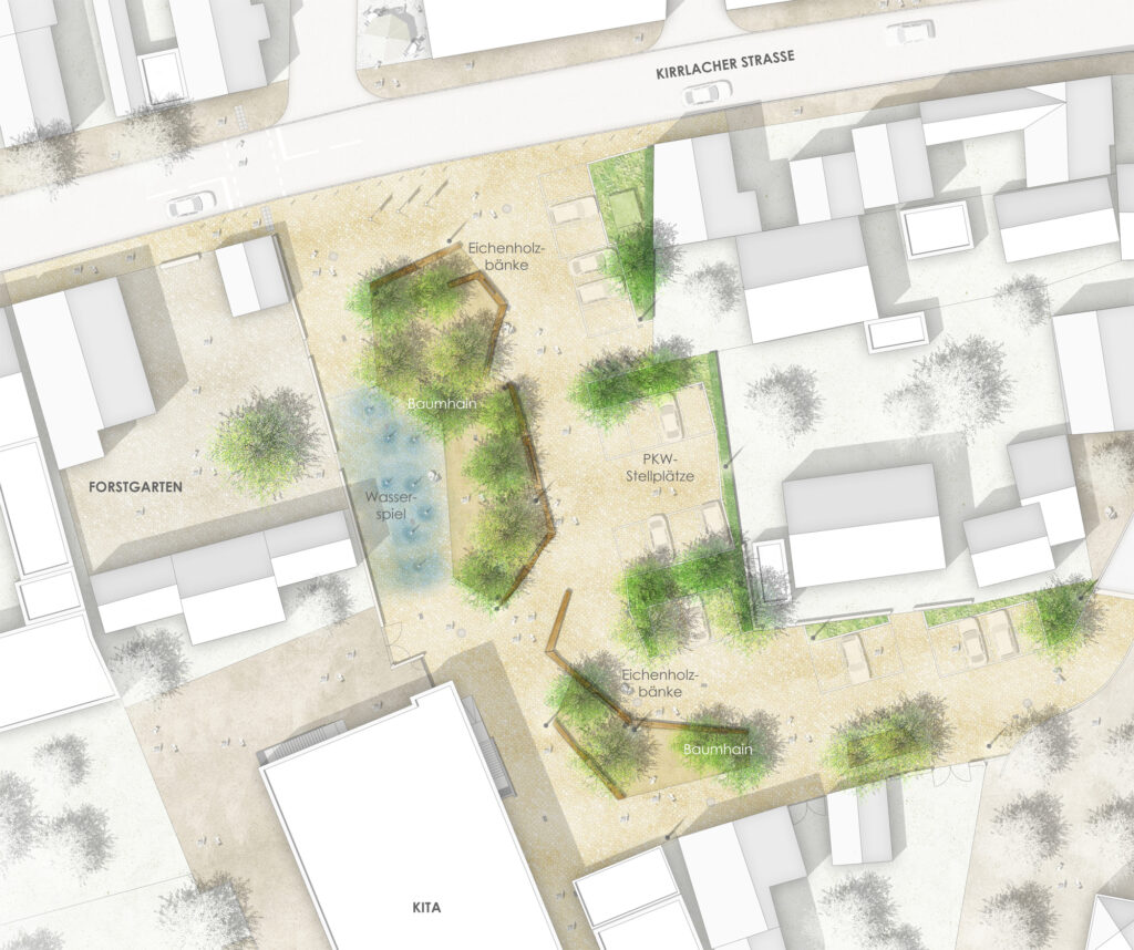 Der Entwurf sieht eine großzügige, befestigte Platzfläche vor. Während an der Ostseite Parkplätze für den Einkauf im angrenzenden Einzelhandel realisiert wurden, dient die westliche Platzhälfte als Aufenthaltsort. Der südlich gelegene Neubau des Kinderhauses wurde ebenso in die Planung integriert wie das bereits erwähnte Forsthaus im Nordwesten. Eigens angefertigte, skulptural anmutende Sitzbänke tragen die botanischen und deutschen Namen heimischer Baumarten als Inschrift und stellen so den Bezug zum Forstgarten her. Gleichzeitig strukturieren die Holzbänke den Platzbereich, können im Bedarfsfall aber zur Seite geräumt werden. So kann je nach Platzbedarf genügend Raum für Straßenfeste, Wochenmärkte oder sonstige Veranstaltungen geschaffen werden. Ein Teil der Platzfläche wurde als wassergebundene Wegedecke hergestellt, die zum Boulespiel einlädt. In ihr stehen locker verteilte Solitärbäume unterschiedlicher Arten. Das Spiel der verschiedenen Blattstrukturen und Herbstfärbungen findet sich auch im Pflanzkonzept wieder. Dank der zurückhaltenden Pflanzenwahl fügen sie sich harmonisch in die Gesamtgestaltung ein. Neben dem diffusen Schattenspiel der Bäume beeinflusst ein Fontainenfeld das Mikroklima des Dorfplatzes. Das leise Plätschern des Wassers lässt den Besucher dem Alltag entfliehen, während die Bänke zum Verweilen im Zentrum Kronaus einladen.