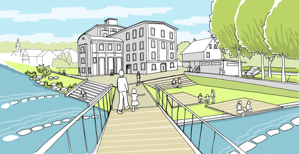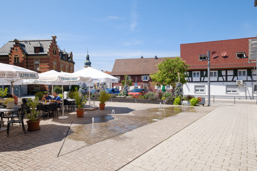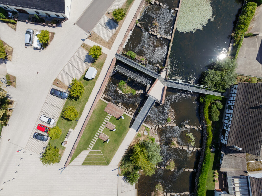 Im Zuge der Mühlensanierung wurden auch die angrenzenden Freianlagen umgestaltet. Eine neue, lebendige Ortsmitte sollte entstehen, die neben Aufenthaltsmöglichkeiten vor allem das Ortsbild aufwerten sollte. So entstand nordöstlich der Mühle ein neuer Treffpunkt in Form eines Dorfplatzes. Dieser wird auf der Ost- und Südseite von einem neuen Wohn- und Geschäftshaus gefasst. Im Westen grenzt das Rathaus an und im Norden kann man den vorbeifahrenden Verkehr der Hauptstraße beobachten. Räumlich wird die Straße durch eine langgezogene Sitzbank und Pflanzgefäße vom Platz getrennt. Bäume sorgen für Schatten und das leise Plätschern des Wasserspiels für Aufenthaltsqualität. Ein Café belebt den Platz zusätzlich. Die zentrale Platzfläche wurde mit Granitpflaster gestaltet, das sich bis zum Rathauseingang im Westen, über den Straßenraum zieht und einen großzügigen Teppich ausbildet. Hier flankieren Fahnenmasten und Fahrradständer den Zugang zum Gebäude. Weiteren Belagsflächen wurden in einem farblich angepassten, durchlaufenden Betonpflaster hergestellt. Es verbindet den Dorfplatz mit dem südlich der Mühle gelegenen, großzügigen Veranstaltungsplatz für Dorffeste. Im Belag eingelassene Zelthülsen ermöglichen den reibungslosen Aufbau der Festzelte, während eine Bodenhülse das Stellen des Mai- und Weihnachtsbaumes ermöglicht. Auch die Wasser- und Stromanschlüsse wurden in der Planung berücksichtigt. Weiter südlich schafft der abgesenkte Flößergarten einen attraktiven Aufenthaltsbereich am renaturierten Kinzigufer.