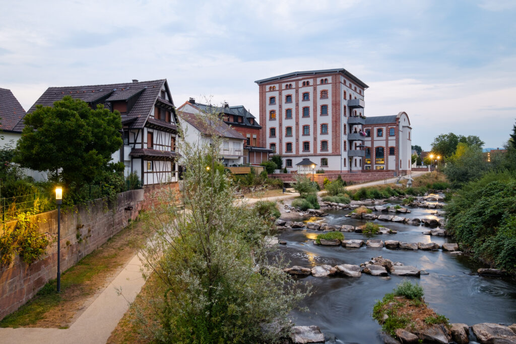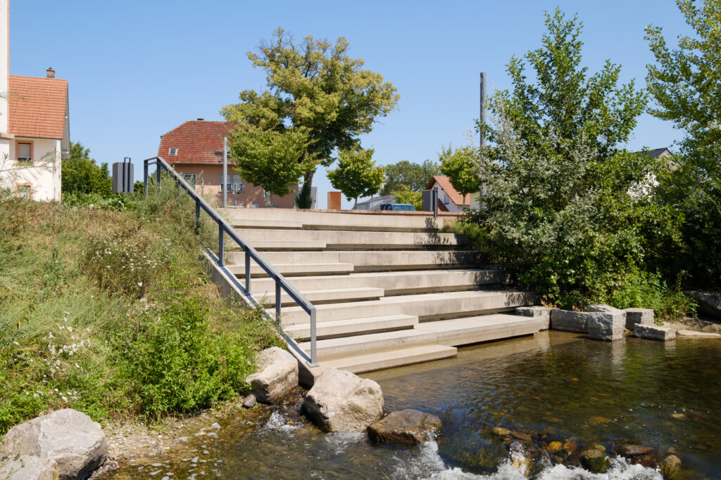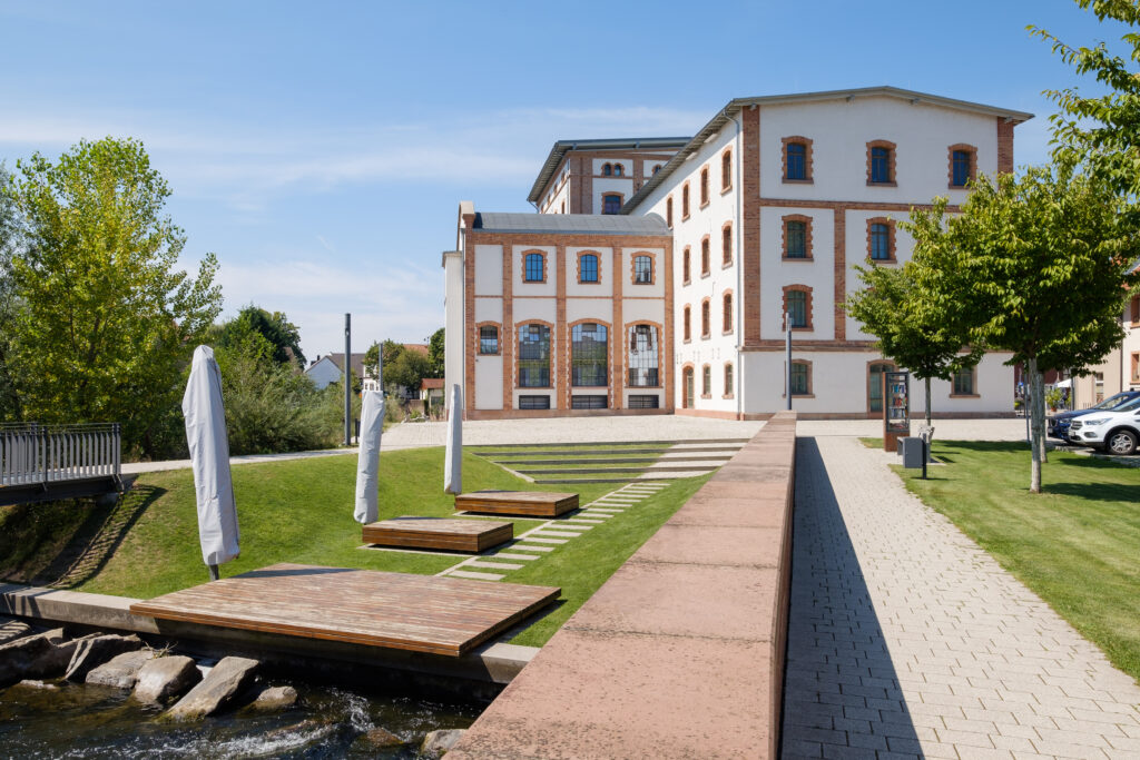 Über Rasenstufen gelangt man in den tieferliegenden Bereich, der mit seinen massiven Holzdecks zum Entspannen lockt. Auch als Trauzimmer im Freien dienen die Decks gelegentlich. An warmen Sommertagen lässt sich das kühle Nass der Kinzig hier besonders gut erleben. Dazu trägt auch die große Freitreppe am westlichen Rand des Veranstaltungsplatzes bei. Sitzstufen ermöglichen hier ebenfalls das Verweilen am Bach. Macht man sich über den neugeschaffenen Uferweg in Richtung Norden auf, so findet man zusätzliche Sitz- und Liegemöglichkeiten vor, die zum Relaxen einladen. In Richtung Süden gelangt man hingegen auf die historische Wehranlage, die von einer instandgesetzten Bastion und zahlreichen Stegen geprägt ist. Letztere Schaffen die fußläufige Verbindung der beiden Uferseiten. Bewusst wurden Elemente wir der ehemalige Rechenfang beibehalten. Sie verweisen auch heute noch auf die Geschichte des Ortes. So auch die bereits beschriebenen Holzdecks im Flößergarten, die auf die lange Tradition des Flößens an der Kinzig verweisen. Die Randbereiche, also der Übergang vom Ufer der Kinzig zu den Wegen und Platzbereichen, wurden mit großen Findlingen und einer abwechslungsreichen Bepflanzung gestaltet. Mehrstämmige Erlen bieten Schatten und greifen das Thema „Bach“ gestalterisch auf. Die historischen Buntsandsteinmauern wurden aufwendig saniert und teilweise authentisch ergänzt bzw. weitergeführt. Hinter der Ufermauer verläuft ein Fußweg, der das Rathausareal in Richtung Süden mit dem angrenzenden Grünzug verbindet. Parkplätze für Besucher des Rathauses wurden im Süden ebenfalls realisiert. Sie werden durch einen Kirschhain, der vor allem im Frühling mit seiner üppigen Blüte besticht, beschattet. Zahlreiche Sitzgelegenheiten bieten Passanten die Möglichkeit zum Verweilen. Eine pflegeextensive Staudenpflanzung sorgt für farbliche Akzente und vervollständigt das Pflanzkonzept. Die Materialauswahl orientiert sich am historischen Bestand. In der Planung wurde auch die Möglichkeit zur nachträglichen Errichtung eines Servicegebäudes für Veranstaltungen berücksichtigt. Neben einer Grund- und Sicherheitsbeleuchtung der Straßenräume sorgt eine Akzentbeleuchtung der Plätze auch in den Abend- und Nachtstunden für Aufenthaltsqualität. Eine besondere Technik kommt bei der Beleuchtung der Gebäudefassade des ehemaligen Mühlengebäudes zum Einsatz. Sogenannte Gobo-Strahler ermöglichen eine gerichtete, blendfreie Ausleuchtung der Fassaden.