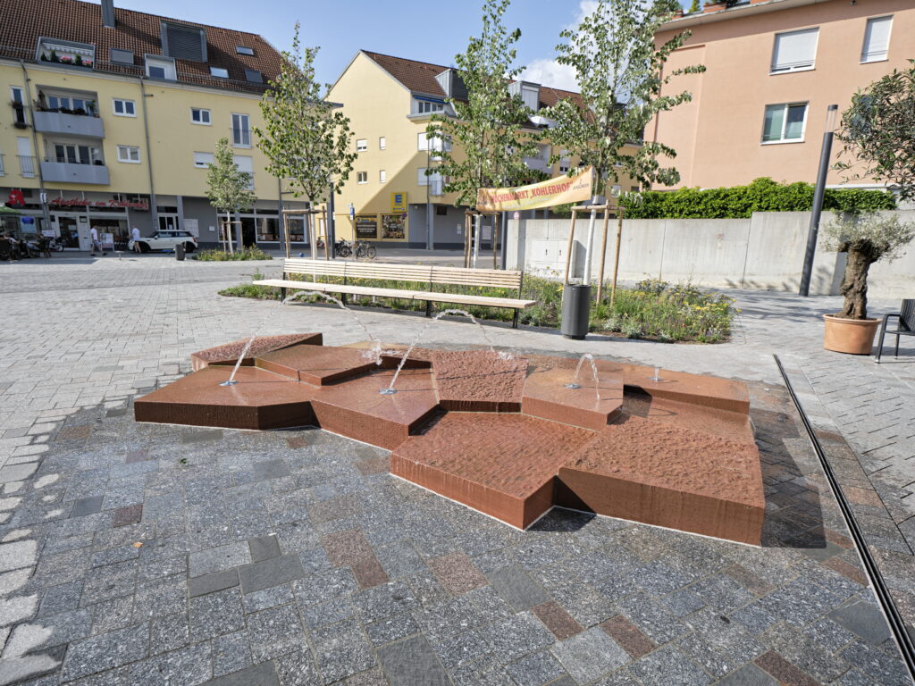 Ein durchgängiger Bodenbelag, Pflanzflächen und neue Bäume prägen die neue Ortsmitte von Denzlingen. Klares Highlight ist das Wasserspiel aus Sandsteinblöcken, aus denen Wasserbögen hervortreten und zum Spielen an warmen Sommertagen einladen.