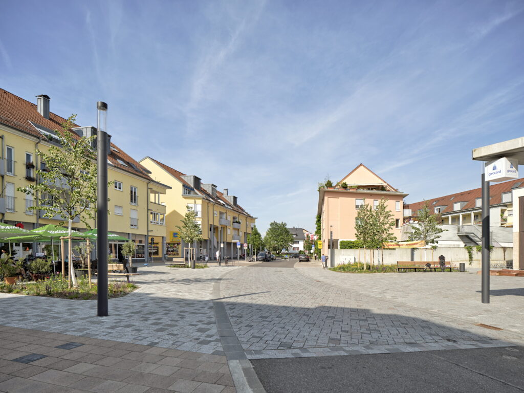 Eine attraktive Ortsmitte mit Marktplatz war der lange gehegte Wunsch der Gemeinde Denzlingen. Die Neubebauung durch ein Wohn- und Geschäftshaus in zentraler Lage schuf die Voraussetzungen für eine Realisierung. Der neue Platz spannt sich zwischen Neubau und vorhandene Bebauung. Der Platzboden ist über die Straße hinweg mit Natursteinpflaster aus verschiedenen changierenden Materialien in unterschiedlichen Formaten lebendig gestaltet. Baumpflanzungen in großen, staudenbewachsenen Beeten sorgen dauerhaft für ein grünes Umfeld. Zum Spielen laden filigrane Wasserbögen ein, die aus Sandsteinblöcken hervortreten. Auch der Wochenmarkt findet seinen Platz. Die angrenzenden Straßenbereiche wurden ebenfalls erneuert und werden von Baumpflanzungen begleitet. Eine grüne Ortsmitte kann wachsen.