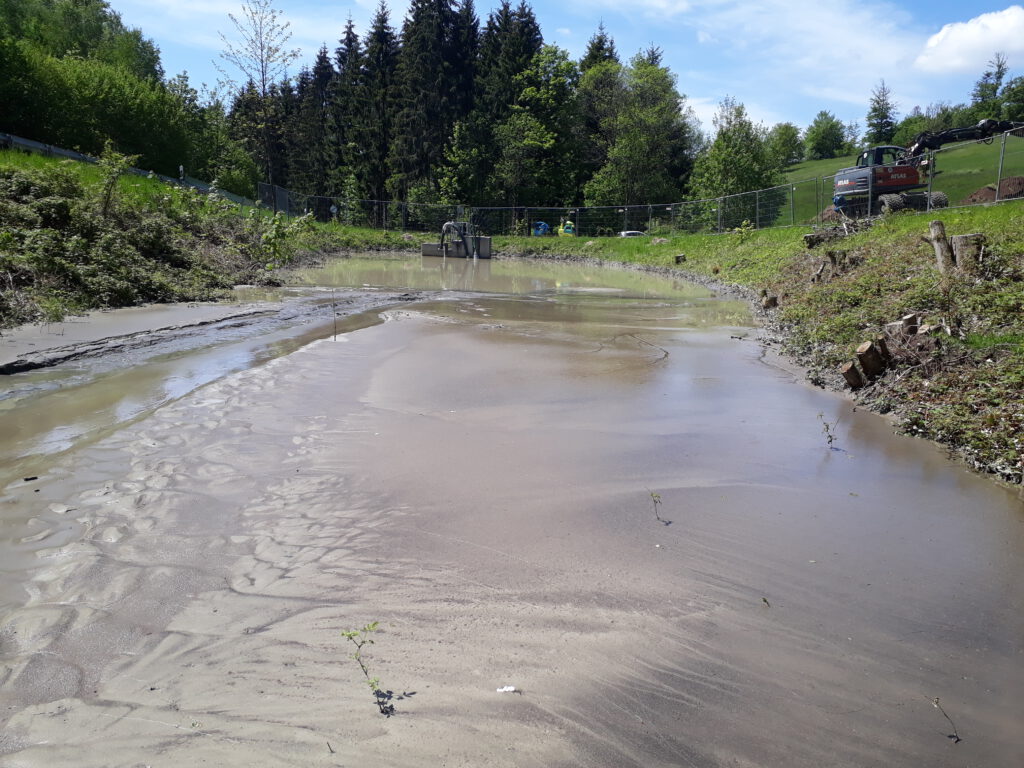 Das Stauziel des Eggbergbeckens liegt auf 700,85 m ü. NN. Zunächst erfolgte die Entleerung des Eggbergbeckens im Turbinenbetrieb bis Absenkziel 679 m ü. NN. Das „Restwasser“ im Becken musste durch einen Entleerungsstollen in die Ausleitungsgewässer „Pfannenstielgraben-Schöpfebach“ abgegeben werden. Durch die während der Entleerung entstehenden Strömungen und Turbulenzen kann ein Sedimentaustrag aus dem Becken nicht vollständig ausgeschlossen werden. Zur Verhinderung des Sedimenteintrags vom Eggbergbecken in die Ausleitungsgewässer wurden diverse Maßnahmen von der Schluchseewerk AG getroffen. Um die Auswirkungen der verbliebenen Sedimentfracht beurteilen zu können sowie deren Maßnahmen zu überwachen und dokumentieren, wurde BHM für die Umweltbaubegleitung hinzugezogen.